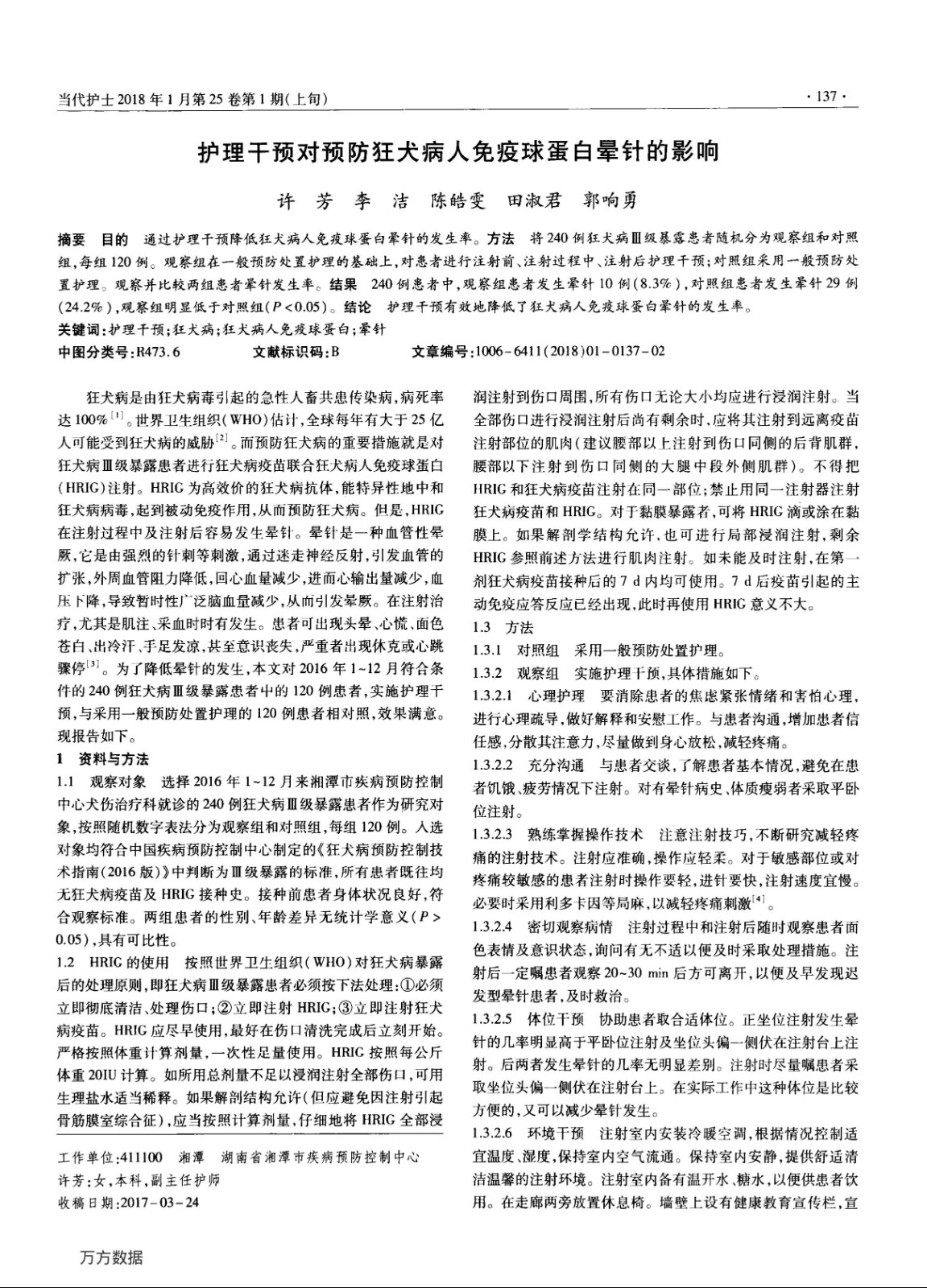 護理干預對狂犬病人免疫球蛋白暈針的影響